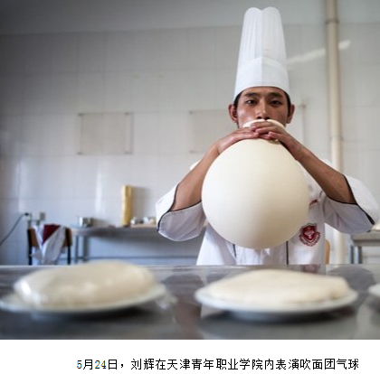 日前,劉輝在上海大世界吉尼斯紀(jì)錄挑戰(zhàn)中,甩出一根1918米的面,打破原“南詔一根面”1704米的世界紀(jì)錄,同時(shí)用面團(tuán)吹出直徑1.5米的“氣球”,獲得“最長一根面”和“直徑最大的面團(tuán)氣球”兩項(xiàng)上海大世界吉尼斯紀(jì)錄。22歲的天津青年職業(yè)學(xué)院烹飪系教師劉輝,來自山西太原,學(xué)習(xí)面食技藝已經(jīng)5年多,堪稱面食“達(dá)人”。