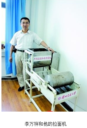 這種拉面機(jī)長(zhǎng)1.8米,高1.5米,寬80厘米,一般拉面店都能放得下。1.5千瓦的拉面機(jī)20分鐘就能完成50斤面的全部和面、揉面、甩面、順筋、拉面工序。在李萬(wàn)祥的辦公室,記者看到,從機(jī)器出口處倒入水和面粉,出口處便可得到成型的面棒,甚至面條。如果用人工,一個(gè)人需8小時(shí)才能完成這些工序。“不過(guò)我現(xiàn)在并不想直接生產(chǎn)出來(lái)拉面的面條,主要怕老百姓一時(shí)接受不了!