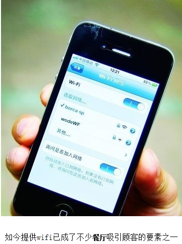 “現(xiàn)在用智能手機、平板電腦的人越來越多,店里有無線網(wǎng)絡,也是給客人提供方便!迸f城一家茶餐廳店長稱,如果無線網(wǎng)不設置密碼,周圍“蹭網(wǎng)”的人會更多,而帶寬是不變的,這樣店里的客人使用無線時速度就會減慢。當然餐廳提供wifi也帶來一些不便。該店長告訴記者,有些蹭網(wǎng)鐵粉經(jīng)常到餐廳一帶消費,對各家店鋪的wifi密碼熟記于心,有時甚至出現(xiàn)在別家消費蹭隔壁的wifi,造成本店消費者上網(wǎng)速度緩慢,該店長對此表示無奈,“店里也不能為了防止‘蹭網(wǎng)’不斷更換密碼,這樣會對本店消費者造成困擾,更重要的是,飯店提供無線網(wǎng)絡,本身就是增加‘黏性’,希望更多消費者選擇本店就餐!