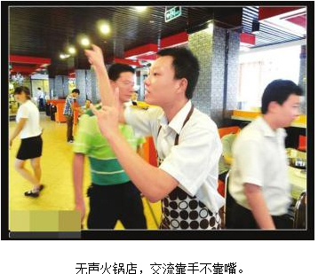 “因為曾經(jīng)受到過聾啞人的幫助,現(xiàn)在就想做點事回饋他們這個特殊的人群”,火鍋店的負責人賀元國告訴記者,“希望這樣的愛心可以傳遞下去!薄斑@些聾啞人責任心很強,在工作中,受外界干擾小,總是給顧客以發(fā)自內(nèi)心的甜美微笑!