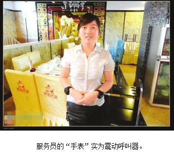 據(jù)大堂經(jīng)理介紹,每個服務員手腕上,都戴著一個像手表一樣的“服務呼叫器”,上有加菜、酒水、買單、服務和取消等功能。當客人有需要時,按清單上的按鈕,其所在餐桌的號數(shù)、所需服務的種類,就會通過該服務呼叫器顯示,以震動方式告知服務員。