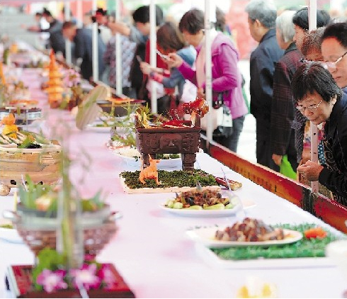 一年一度“中國(guó)?臨安百筍宴美食文化節(jié)”上,臨安市28家主要餐飲企業(yè)為市民獻(xiàn)上一桌桌獨(dú)具匠心的筍宴和百余只筍菜,引來(lái)眾多食客圍觀。梁臻、張偉星攝