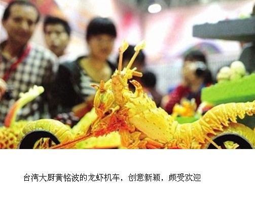 展臺(tái)上還有西瓜雕刻的孔雀、鹽巴堆成的七巧板、龍蝦殼做的哈雷摩托……這些充滿創(chuàng)意的食材造型吸引了很多人。