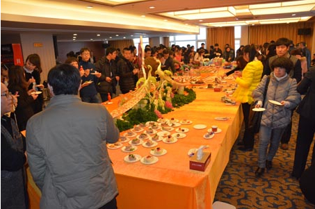 “跨年”野豬盛宴脫離了那種傳統(tǒng)的圓桌模式,以西方宴會特有的自助形式呈現(xiàn)在眾多美食達(dá)人面前。在一張寬3米、長15米的大型餐桌上,121道菜品被分成了13個區(qū)域進行擺放。