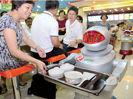 全國首家機(jī)器人餐廳日前亮相江蘇昆山。走進(jìn)這家餐廳,“大黃蜂”為您唱歌跳舞,“擎天柱”的兄弟“鐵皮”負(fù)責(zé)安保,禮儀機(jī)器人親切迎賓,科幻片中的奇妙場景變?yōu)楝F(xiàn)實(shí)。這些機(jī)器人掌握了迎賓、點(diǎn)餐、傳餐、炒菜、烹炸、煮水餃、下面條等本領(lǐng),還會說40句基本用語,如“你的菜到了,請慢用”等,當(dāng)你擋住機(jī)器人的路時,它則會說“請讓一下,我很忙噠!”