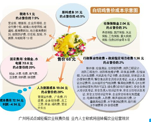“點只白切雞,一條腿交稅!”據(jù)飲食商會的數(shù)據(jù)顯示,廣州餐飲業(yè)要繳納的稅費高達50項,占營業(yè)收入的12.5%。記者從廣州市經(jīng)貿(mào)委獲悉,為推動餐飲業(yè)的大眾化轉(zhuǎn)型升級,商務(wù)部即將在廣州試點減輕餐飲業(yè)稅費負擔(dān)。