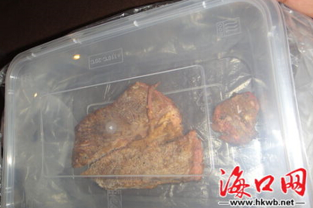 陳先生夫婦到海甸島三東路與人民大道交匯處某茶藝快餐廳就餐時,發(fā)現(xiàn)全熟的牛排肉體內(nèi)有疑似已經(jīng)死亡的蟲子類物體,要求餐館負(fù)責(zé)人與其一道將該食物送到附近醫(yī)院化驗(yàn)遭拒后,遂向食品藥品監(jiān)督管理部門投訴。今天(11日)上午,美蘭區(qū)食品藥品監(jiān)督管理局執(zhí)法人員對該牛肉食品進(jìn)行封存送檢。