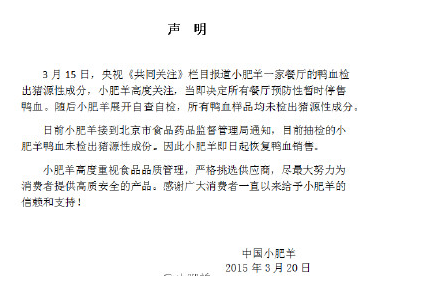 20日晚間,小肥羊再次發(fā)布聲明,稱自從被央視曝光后,公司便展開自檢自查,所有鴨血樣品均未檢出豬源性成分!澳壳靶》恃蚪拥奖本┦惺称匪幤繁O(jiān)督管理局通知,目前抽檢的小肥羊鴨血所有樣品均未檢出豬源性成分,因此小肥羊即日起恢復(fù)鴨血銷售”。