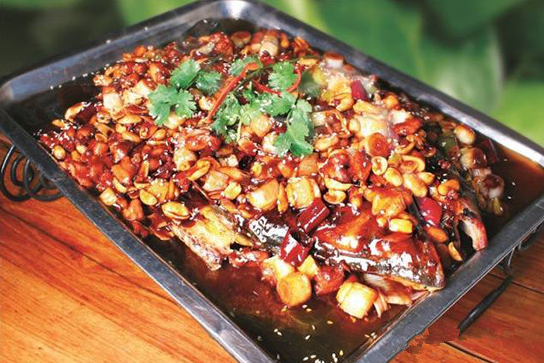 5、凈鍋下一半碗汁熬開(kāi)、攪濃,起鍋淋到烤魚周圍。6、鍋下底油燒熱,加入干辣椒段15克炸至棕紅色,再放入花椒8克炸香,隨后下蔥丁30克、姜丁8克煸香,倒入雞丁翻炒均勻,烹入剩余的料汁快速翻裹均勻,撒入油酥花生米200克翻勻,調(diào)少許油辣椒起鍋蓋到烤魚上,點(diǎn)火上桌即成。