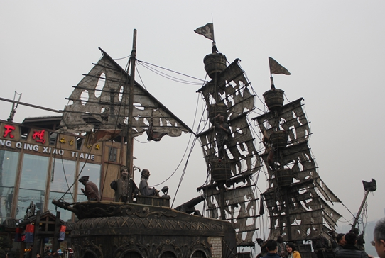 這家火鍋店的負責人告訴記者:“除了火鍋口味保證地道與原汁原味之外,我們玩的就是一個電影噱頭。”重慶是火鍋的重要發(fā)源地,火鍋又包含著重慶的碼頭文化,而電影《加勒比海盜》為觀眾一直熱追,所以設計團隊就決定用加勒比海盜船的模型來布置餐廳場景,并以“坐在船上吃火鍋”為餐廳主題。