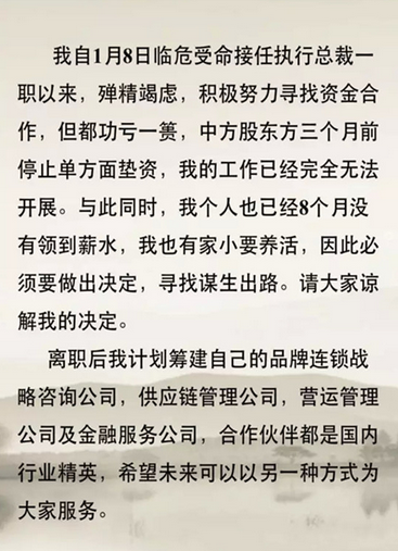 只可惜短短4個多月的時間,戚東就已招架不住,提出辭職。其在辭職信中坦言,自接任總裁一職以來,積極努力尋找資金合作,但都功虧一簣。中方股東也在三個月前就已經(jīng)停止單方面墊資,使得運(yùn)營工作完全無法開展。而他本人已經(jīng)有8個月沒有領(lǐng)到薪水。