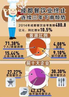 報告顯示,2014年成都餐飲業(yè)零售額480.8億元;同比增長10.5%,較2013年6.3%的增速提升了 4.2 個百分點;高于全國(9.7%)0.8個百分點;高于四川。10.1%)0.4個百分點。