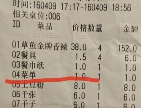 馬先生說(shuō),當(dāng)時(shí)一共消費(fèi)了248元,他仔細(xì)查看賬單,發(fā)現(xiàn)除了一家人消費(fèi)的菜品、餐具以及餐巾紙的價(jià)格外,第四項(xiàng)赫然寫(xiě)著菜單的價(jià)格收費(fèi)一元。他當(dāng)即向服務(wù)員提出異議,對(duì)方只稱規(guī)定是老板定的。