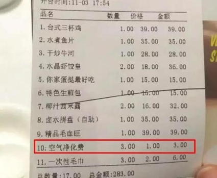 你可能用過(guò)空氣凈化器,也可能聽(tīng)說(shuō)過(guò)“空氣凈化費(fèi)”,但你一定沒(méi)有在餐廳給過(guò)這項(xiàng)費(fèi)用。近日,江蘇省張家港市一家餐廳因?yàn)檫`規(guī)收取“空氣凈化費(fèi)”,被當(dāng)?shù)匚飪r(jià)局警示。