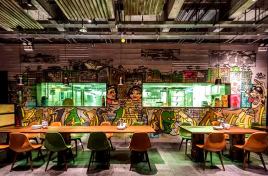 成名于香港的梁經(jīng)倫自然不會(huì)錯(cuò)過(guò)這個(gè)有意思的“罪惡據(jù)點(diǎn)”。Daimon Bistro的入口是一扇深褐色的鐵門,從曖昧的紫色燈光開(kāi)始,破舊的木板墻、模仿腳手架搭起的竹吧臺(tái)、陳舊的電表、半開(kāi)放式廚房外的涂鴉墻,連客人的衣帽間都被設(shè)在鐵網(wǎng)區(qū)域內(nèi)……每個(gè)細(xì)節(jié)似乎都是九龍城寨的縮影。