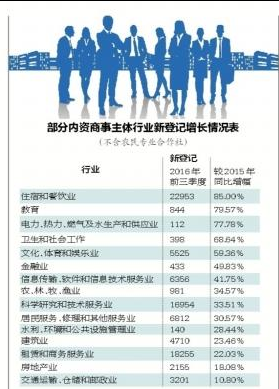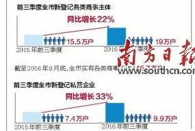 數(shù)據(jù)顯示,前三季度,全市新登記各類商事主體19萬戶,同比增長22%,新登記商事主體增速為近兩年來最高。截至2016年9月底,全市實(shí)有各類商事主體146.7萬戶,高出全國平均增速8個百分點(diǎn)!