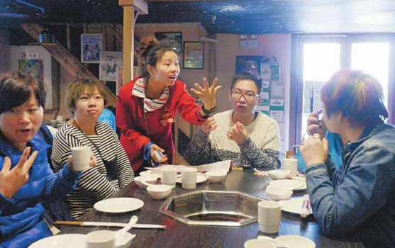 5月17日午飯后,麗江市“和一家無聲餐廳”已過了午餐忙碌時段,服務(wù)員們圍坐在二樓的圓桌旁激烈地“討論”著,他們用手語快速交流,時而露出笑臉,時而擺手。當(dāng)天下午,在麗江市殘疾人聯(lián)合會主辦的2017年助殘日“殘疾人身心健康與事業(yè)發(fā)展”研討會,無聲餐廳的員工們表演了“謝謝你”。