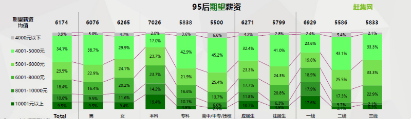 趕集網(wǎng)調(diào)研數(shù)據(jù)顯示,2018年95后應(yīng)屆畢業(yè)生期望薪資的均值為6174元,其中9.5%的畢業(yè)生希望月薪超過10000元,而40%的畢業(yè)生對月薪的期望都超過8000元。與往屆生相比,應(yīng)屆生對薪資的期望更高。然而,95后應(yīng)屆畢業(yè)生的實際薪資平均值為5429元,80%的畢業(yè)生實際薪資在8000元以下,這說明理想與現(xiàn)實仍然存在一定差距。