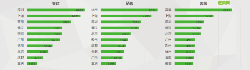 從薪資方面來看,深圳餐飲企業(yè)為95后應(yīng)屆畢業(yè)生提供的平均薪資水平最高,平均達(dá)6623元。其次是上海和蘇州分別為6431元和5998元。銷售類人才的薪資水平方面,杭州、上海、深圳排在前三位,分別為8074元、7795元和7315元?头惾瞬判劫Y,濟(jì)南以6591元明顯高于其他城市,上海和深圳以5759元和5338元分列第二、第三位。一線城市的客服類人才需求量雖然逐年下降,但是因為當(dāng)?shù)匦劫Y水平的差異,一線城市客服類薪資仍保持在較高水平。城市與薪酬,一直是求職者求職的的主要考量因素。做好職業(yè)規(guī)劃,根據(jù)職業(yè)目標(biāo)來選擇相應(yīng)的城市與崗位,十分重要。