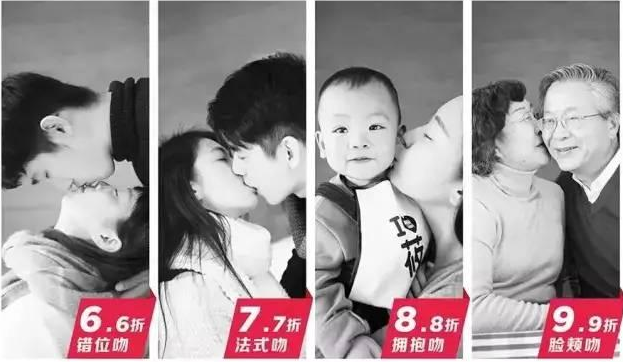 “西貝”為“親嘴打折節(jié)”準(zhǔn)備了一個極其吸引眼球的廣告語“吻得越深,折扣越大”,并設(shè)計了四種不同的親吻姿勢和對應(yīng)折扣。別出心裁的打折方式,給了中國人一次公開高調(diào)秀恩愛的機會!