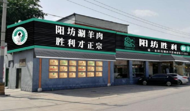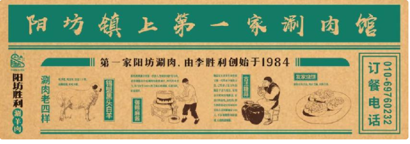首先確定了陽(yáng)坊鎮(zhèn)老店的門(mén)頭上的品牌故事:第一家陽(yáng)坊涮羊肉由李勝利創(chuàng)始于1984,強(qiáng)調(diào)“陽(yáng)坊涮羊肉,勝利才正宗”。