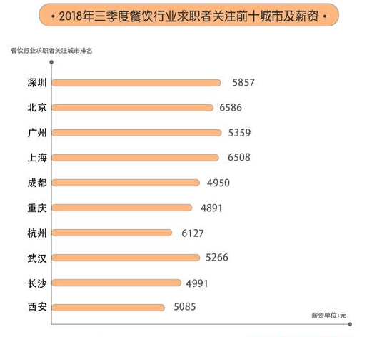 58同城的報(bào)告則顯示,2018年第三季度餐飲業(yè)求職者關(guān)注的前十城市分別為深圳、北京、廣州、上海、成都、重慶、杭州、武漢、長(zhǎng)沙、西安,北上廣深四大一線城市成為最受歡迎的城市。